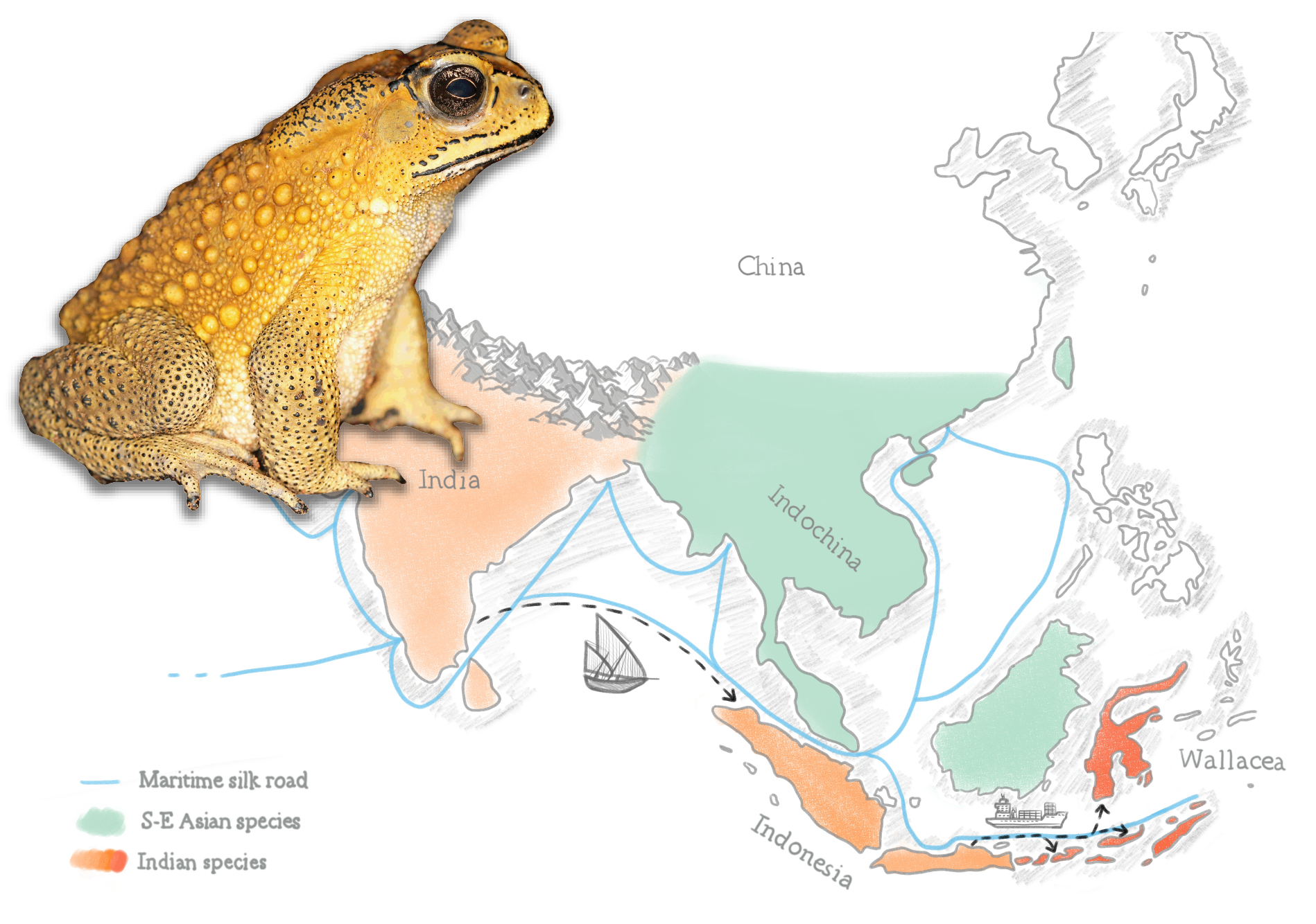 Hình 1. Ảnh chụp Duttaphrynus cf. melanostictus từ Thái Lan (© Christophe Dufresnes) và hình vẽ minh họa tóm tắt phạm vi phân bố của hai loài ẩn dưới tên Duttaphrynus melanostictus (© Johanna Ambu). Sự xuất hiện được cho là của quần thể loài từ Ấn Độ (màu cam nhạt) đến Indonesia (màu cam) bằng con đường tơ lụa trên biển được minh họa bằng tàu buồm và sự mở rộng tiếp theo của nó vào quần đảo Wallacea (màu đỏ) trong những thập kỷ qua được minh họa bằng tàu container.