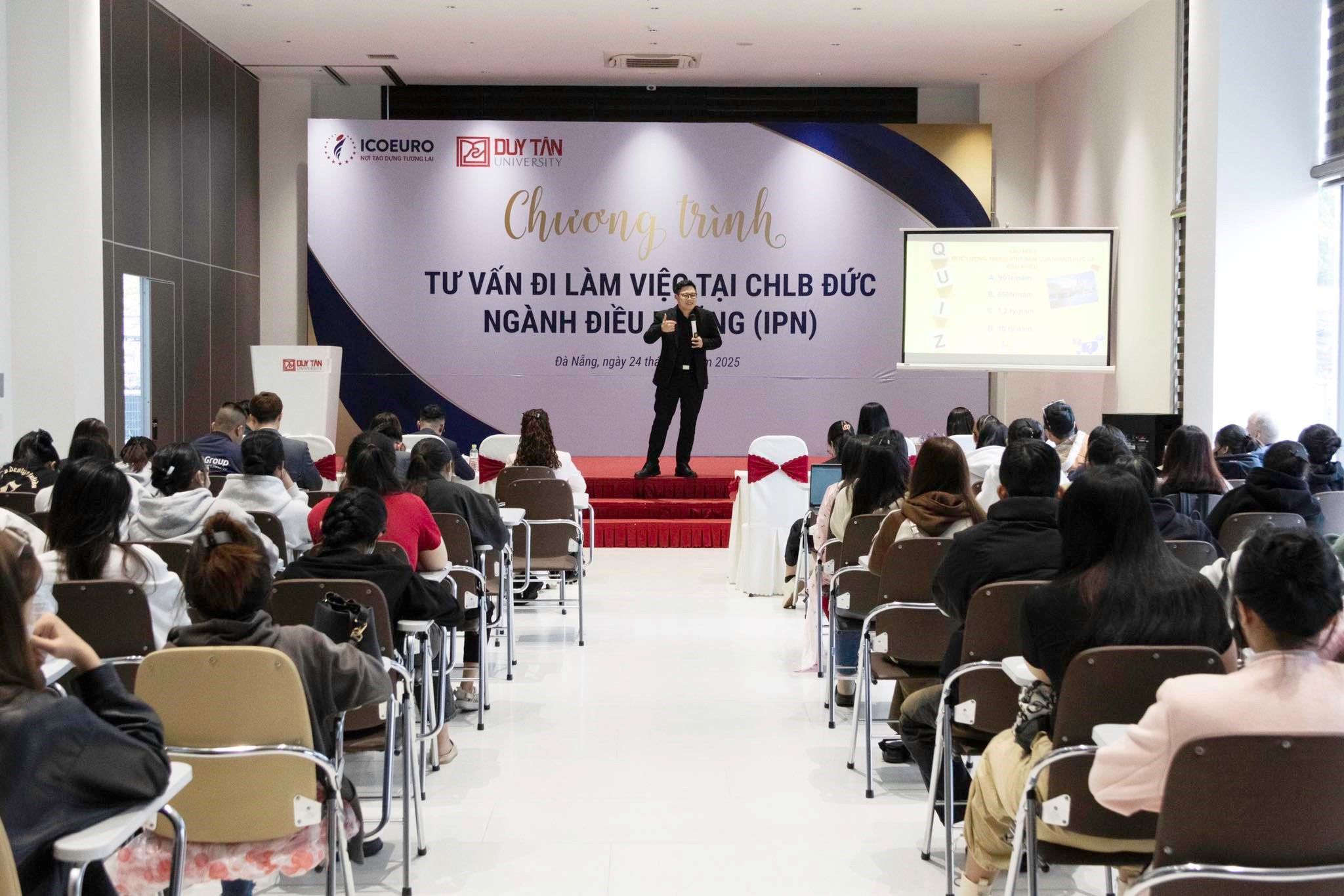 Nhằm tạo điều kiện cho sinh viên Khoa Điều dưỡng có cơ hội tiếp cận và tìm hiểu về triển vọng nghề nghiệp tại Cộng hòa Liên bang Đức, Đại học Duy Tân đã phối hợp với Công ty ICO EURO - đơn vị trực thuộc tập đoàn ICO Group, chuyên cung ứng nhân lực đi làm việc tại Đức, tổ chức Hội thảo "Tư vấn việc làm tại CHLB Đức ngành Điều dưỡng (IPN)" diễn ra vào ngày 24/02/2025. Hội thảo diễn ra trong không khí sôi nổi, thu hút sự quan tâm của đông đảo sinh viên của Khoa Điều dưỡng.