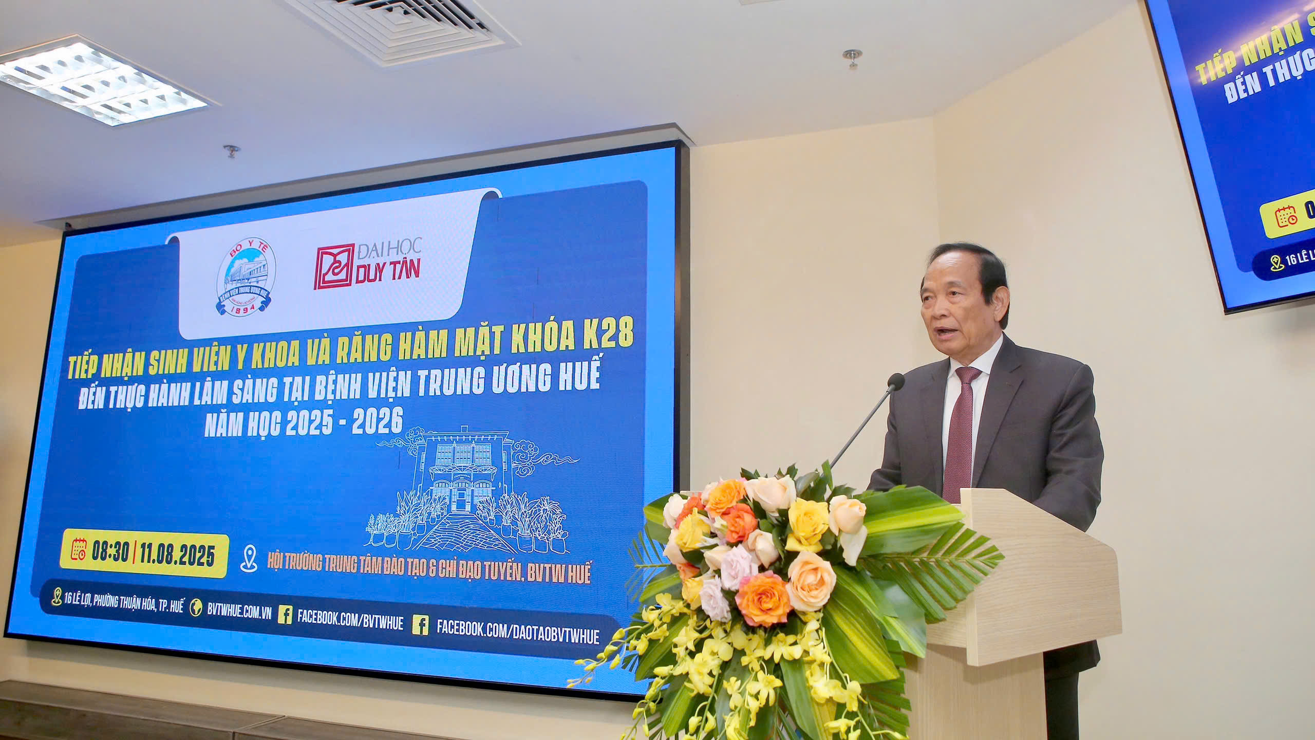 Đại diện Đại học Duy Tân, GS.TS Trần Hữu Dàng đã có lời cảm ơn đến bệnh viện vì đã đồng hành cùng trường trong 7 năm đào tạo lâm sàng vừa qua, GS đánh giá cao tầm vóc của Bệnh viện Trung Ương Huế trong hệ thống y tế Việt Nam cũng như vai trò quan trọng trong nền giáo dục y khoa.