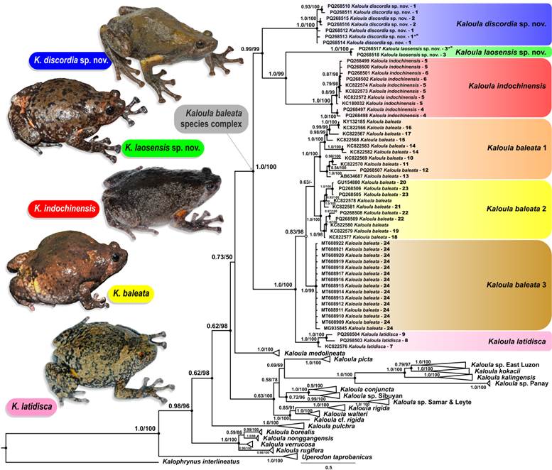 Nguồn tham khảo: Gorin et al. (2024) Phylogeographic pattern and taxonomic revision of the Kaloula baleata species complex (Amphibia: Anura: Microhylidae) with description of two new species from Indochina