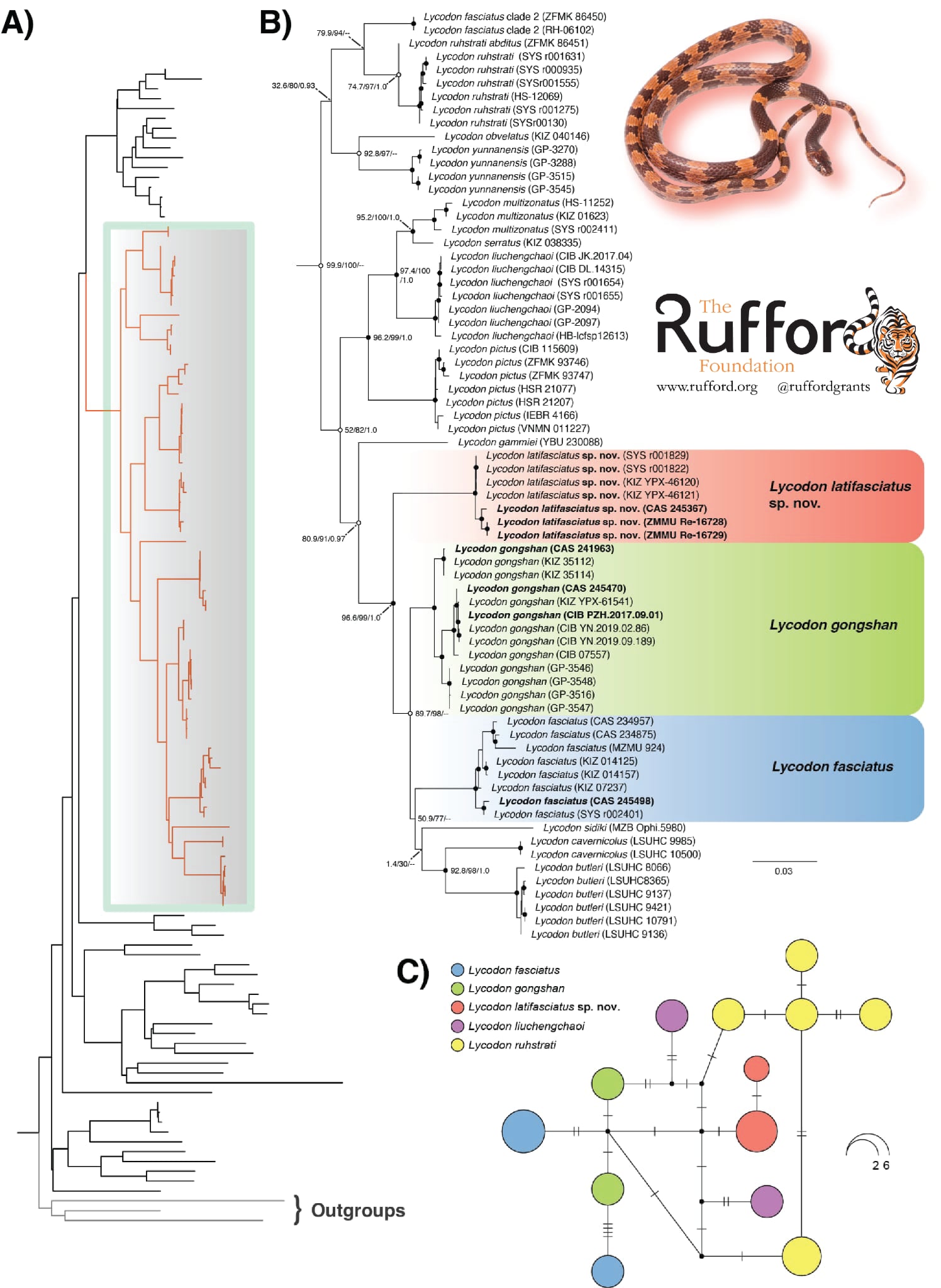 Hình: Cây phát sinh loài cực đại hợp lý (Maximum-likelihood, ML) của chi Lycodon được suy luận từ hai gen ty thể (16S rRNA, CytB) và một gen nhân (Rag1); (A) phiên bản thu nhỏ của cây phát sinh loài ML, với (B) hiển thị phiên bản cắt tỉa của cùng một cây để thể hiện mối quan hệ trong nhóm Lycodon fasciatus, và (C) hiển thị mạng lưới haplotype dựa trên các trình tự Rag1 đã được pha. Các số giữa các nút biểu thị giá trị Bootstrap siêu nhanh (Ultrafast Bootstrap, UF BS), kiểm định xấp xỉ tỉ số khả năng Shimodaira–Hasegawa (SH-aLRT), và xác suất hậu nghiệm Bayes (Bayesian posterior probability, BI PP), theo thứ tự tương ứng. Các nút được tô màu đen biểu thị sự hỗ trợ mạnh từ cả hai phương pháp phân tích, trong khi các nút được tô màu trắng biểu thị sự hỗ trợ mạnh chỉ từ một trong các phân tích ML (hoặc SH-aLRT hoặc UF BS). Ảnh chèn của Lycodon latifasciatus được chụp bởi N. A. Poyarkov.