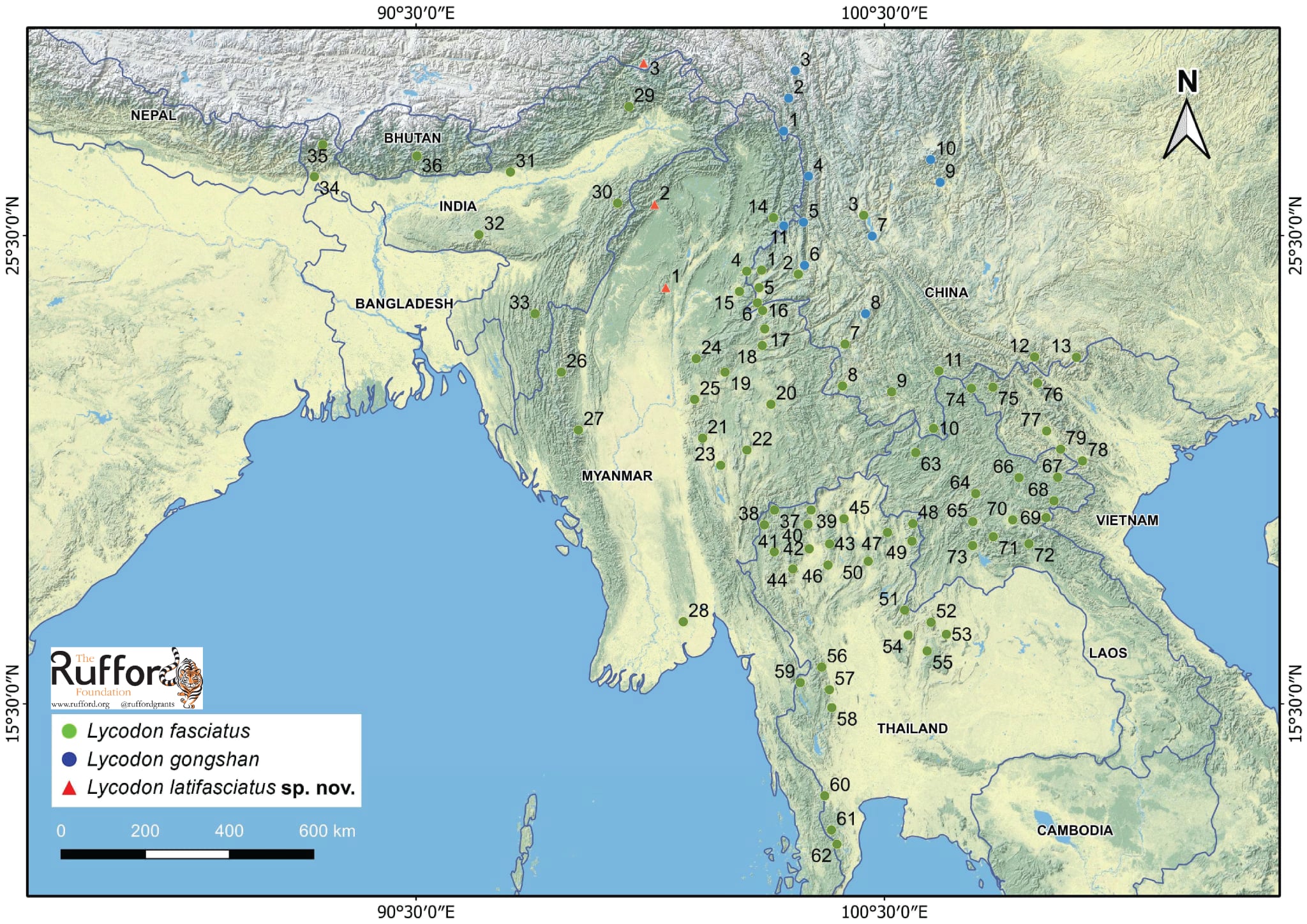 Hình: Phạm vi phân bố của Lycodon latifasciatus sp. nov., L. fasciatus, và L. gongshan. Lưu ý: Các con số biểu thị các địa điểm khác nhau nơi các loài này đã được ghi nhận.