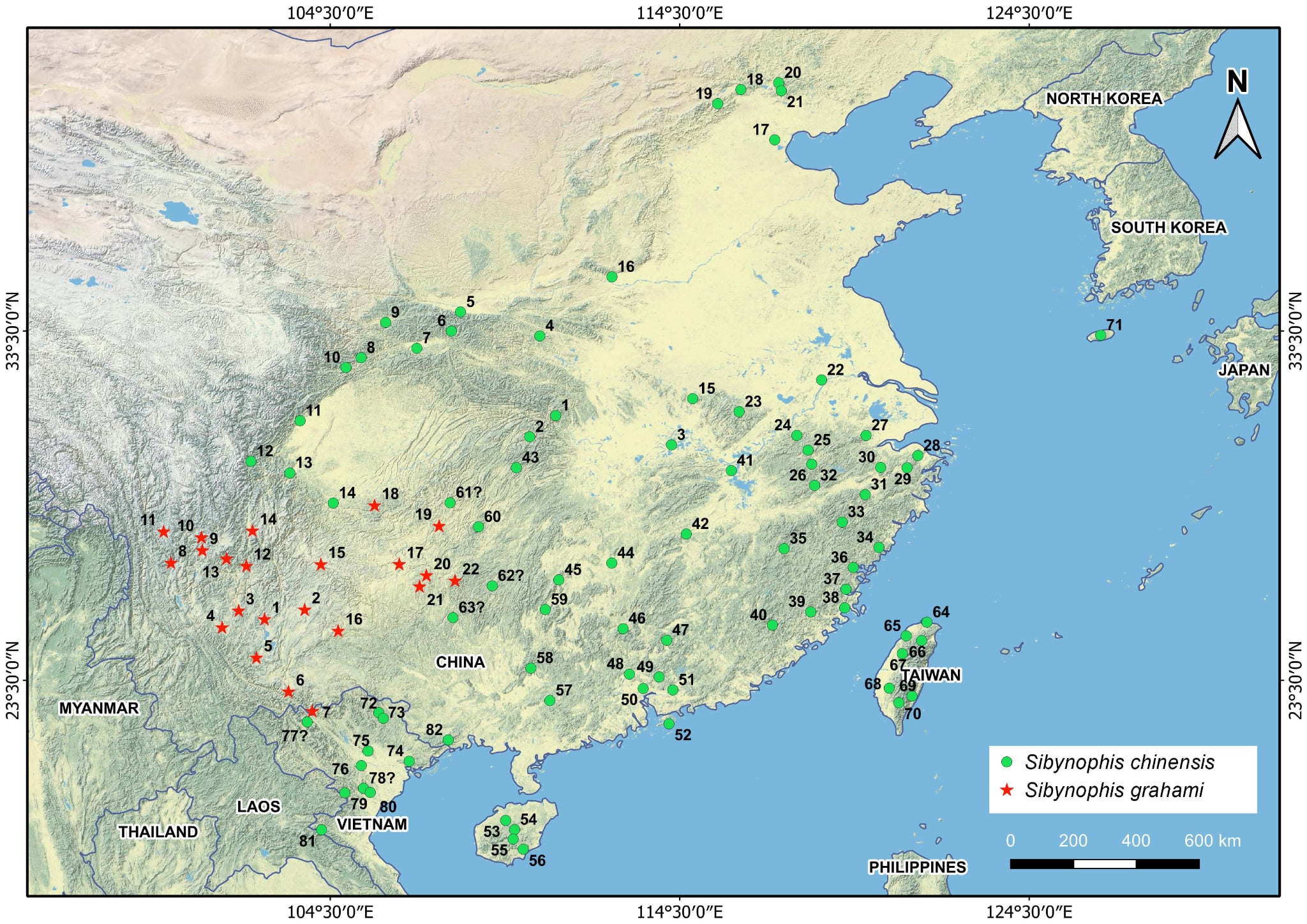 Hình: Phạm vi phân bố của Sibynophis grahami và Sibynophis chinensis ở khu vực Đông Á và Việt Nam