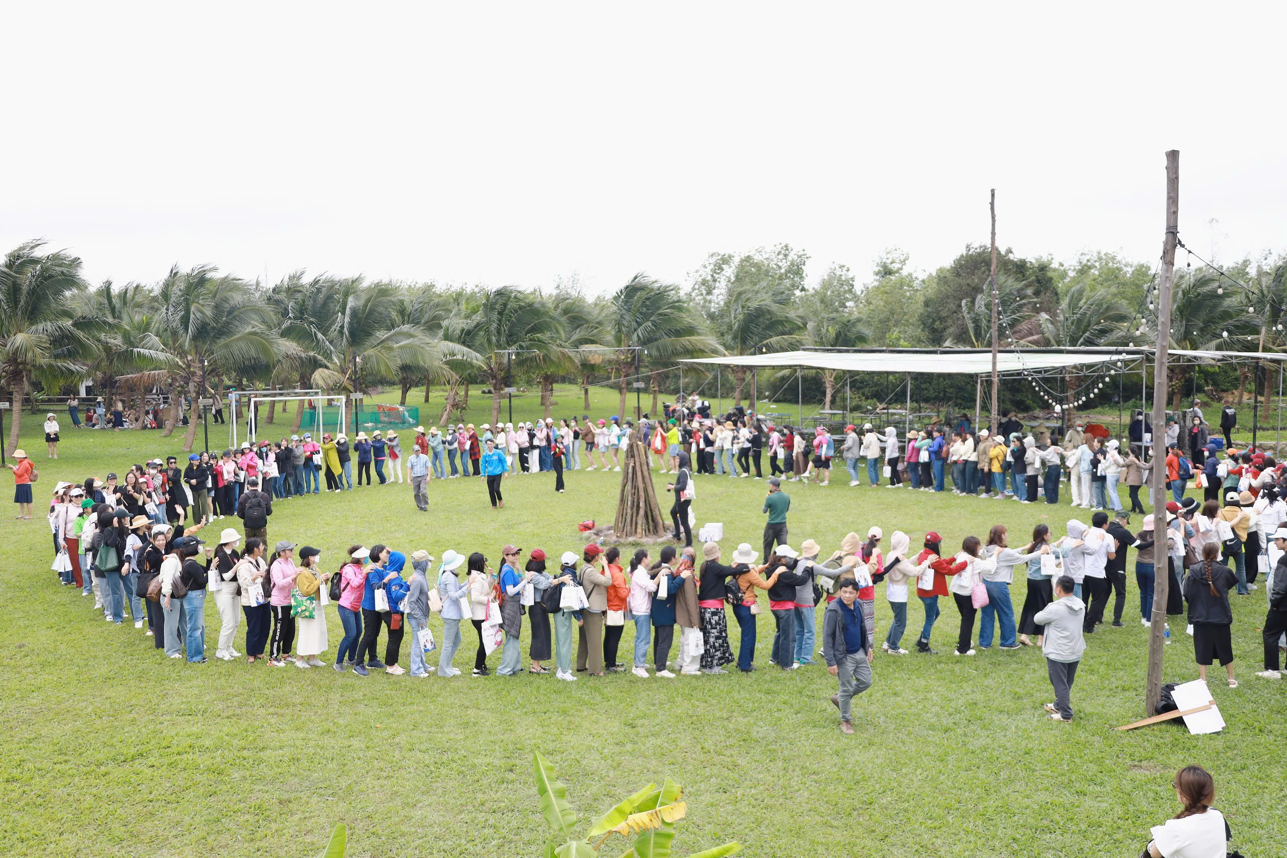 Buổi team-building diễn ra tại Vườn Sinh Thái Lối Xưa với sự tham gia nhiệt tình của hơn 300 chị em từ các khoa, phòng ban trong toàn trường. Chương trình bắt đầu với màn khởi động sôi nổi, giúp các đội chơi gắn kết và chuẩn bị năng lượng cho các thử thách phía trước. Dưới sự hướng dẫn của ban tổ chức, các đội đã tham gia vào nhiều trò chơi mang tính đồng đội cao.