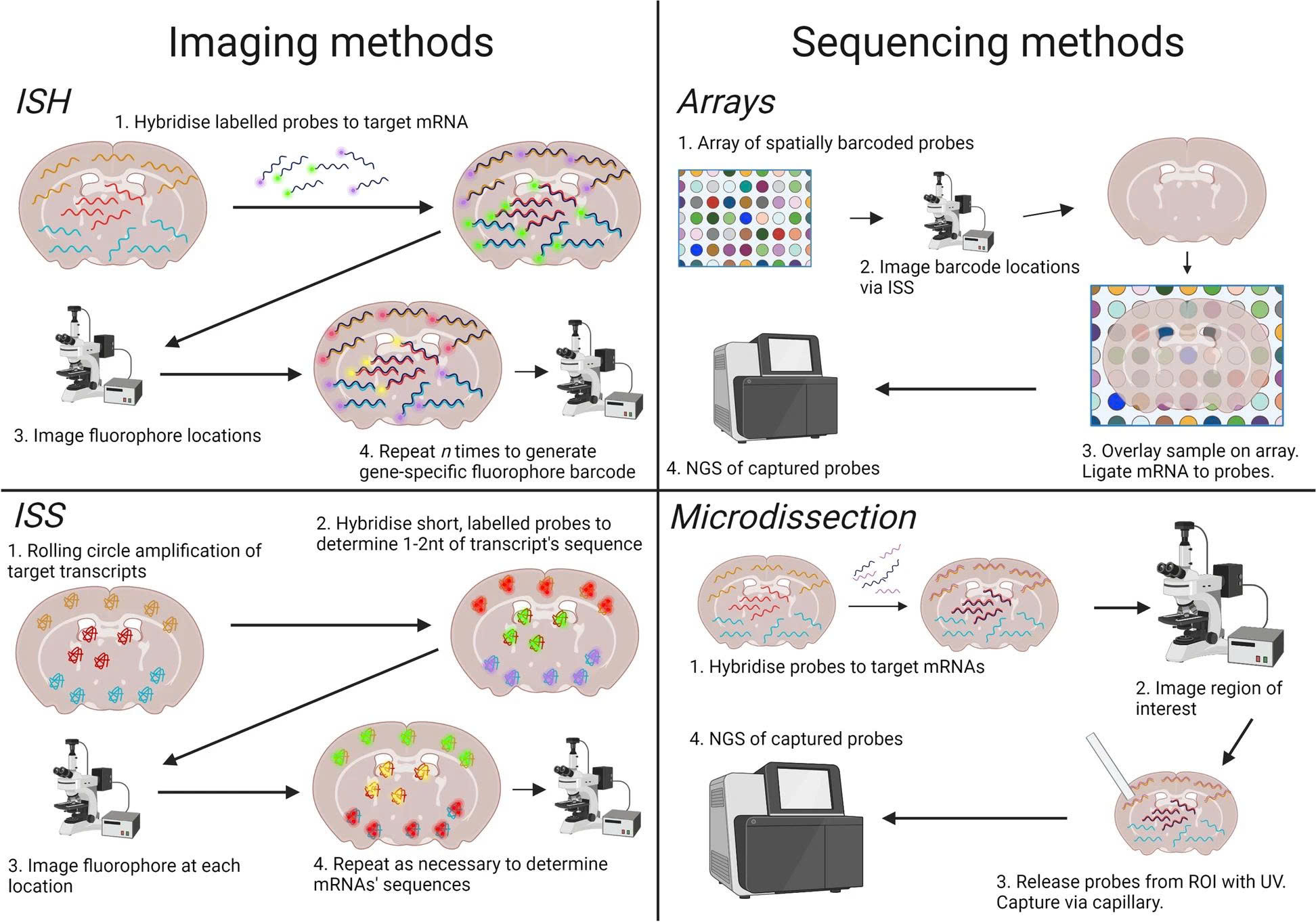 Hình. Bốn phương pháp chính trong Spatial Transcriptomics. (1) in situ hybridization (ISH): các mRNA mục tiêu được lai nhiều lần với các đầu dò probe, mỗi lần được gắn màu huỳnh quang khác nhau để tạo nên được mã vạch màu đặc trưng cho từng loại gene, từ đó xác định được danh tính và vị trí của gene trong mô; (2) in situ sequencing (ISS): Các gene mục tiêu được nhân bản tại chỗ, sau đó dùng các probe ngắn để phân tích trực tiếp trình tự bằng ánh sáng huỳnh quang ngay trên lát cắt mô; (3) Arrays: sử dụng các bề mặt có gắn sẵn mã vạch tọa độ, các mRNA gắn vào các điểm này sẽ được đánh dấu vị trí chính xác trước trước khi giải trình tự; (4) Vi phẫu (microdissection): Chọn trực tiếp các vùng tế bào mục tiêu dưới kính hiển vi, cắt tách và ghi nhận vị trí vùng đó trước khi tiến hành giải trình tự [1]