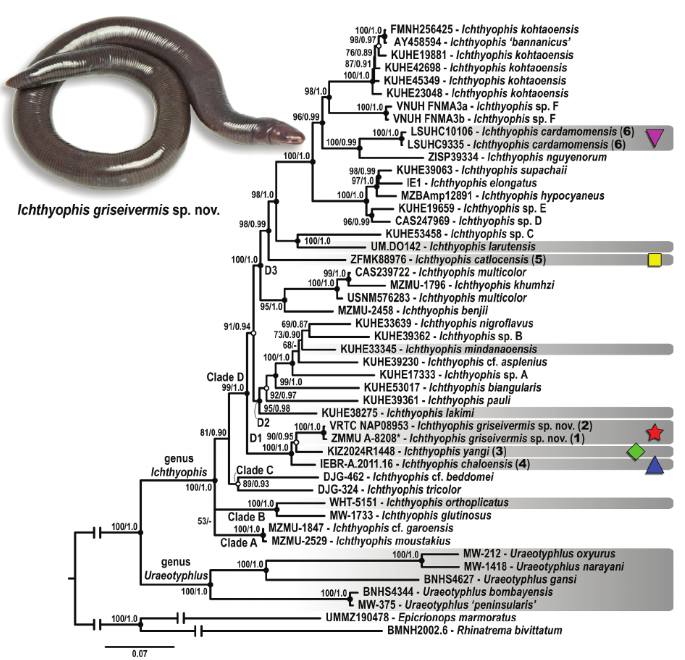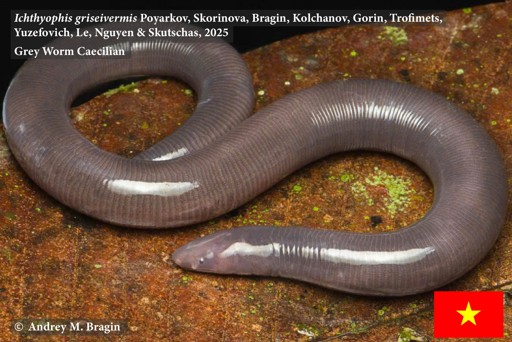 Tài liệu tham khảo: Poyarkov, Skorinova, Bragin, Kolchanov, Gorin, Trofimets, Yuzefovich, Le, Nguyen & Skutschas (2025). Integrative taxonomy reveals a new unstriped Ichthyophis Fitzinger, 1826 from Vietnam and provides new data on diagnostic osteological traits for Asian tailed caecilians (Gymnophiona: Ichthyophiidae). Vertebrate Zoology 75, 2025, 405–4 40 | DOI 10.3897/vz.75.e149399