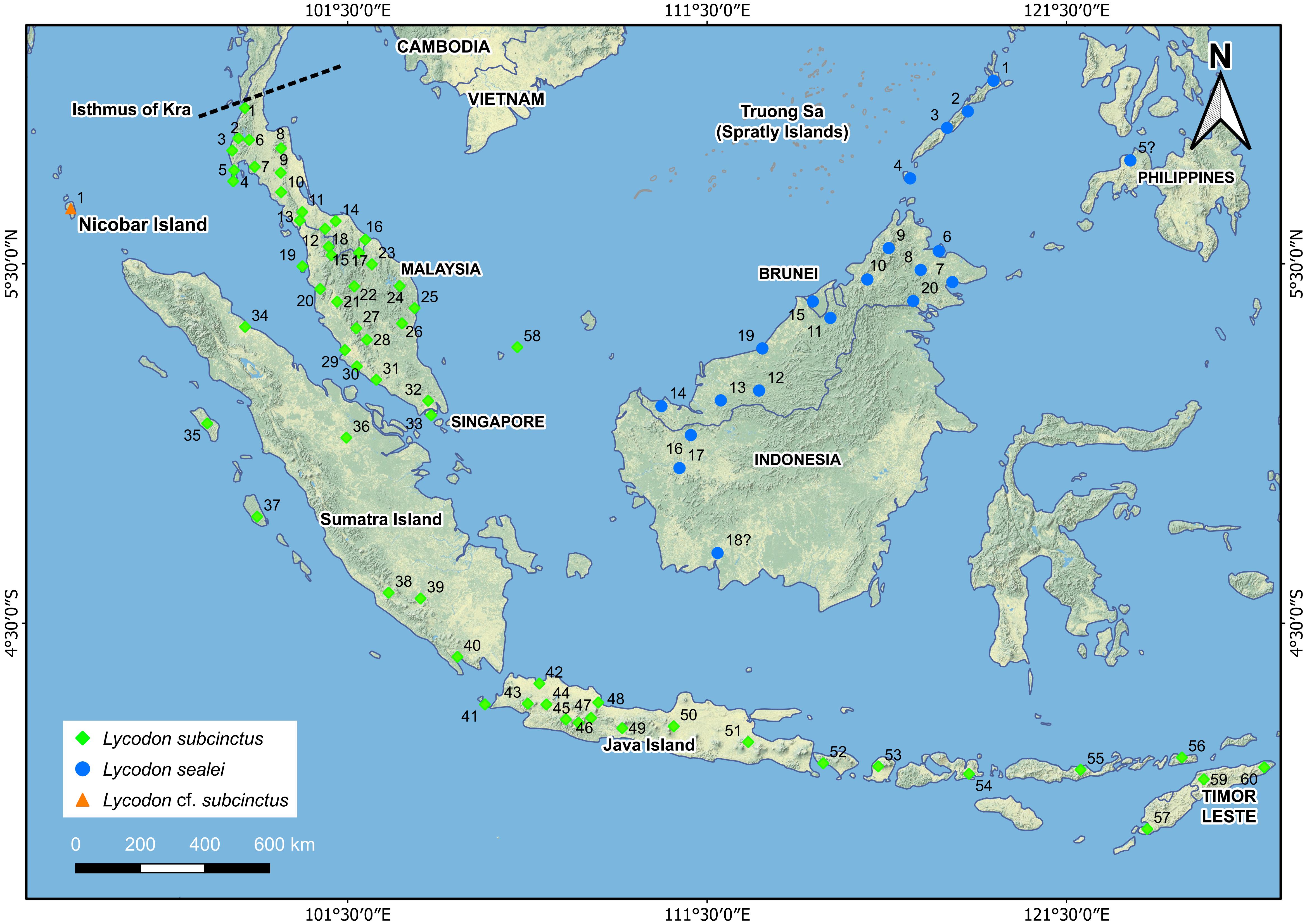 Hình 4. Phân bố của hai loài Rắn khuyết khoanh Mã lai và Rắn khuyết khoanh Sea (©Nguyen et al 2024. Zootaxa, 5519 (4): 487–537)