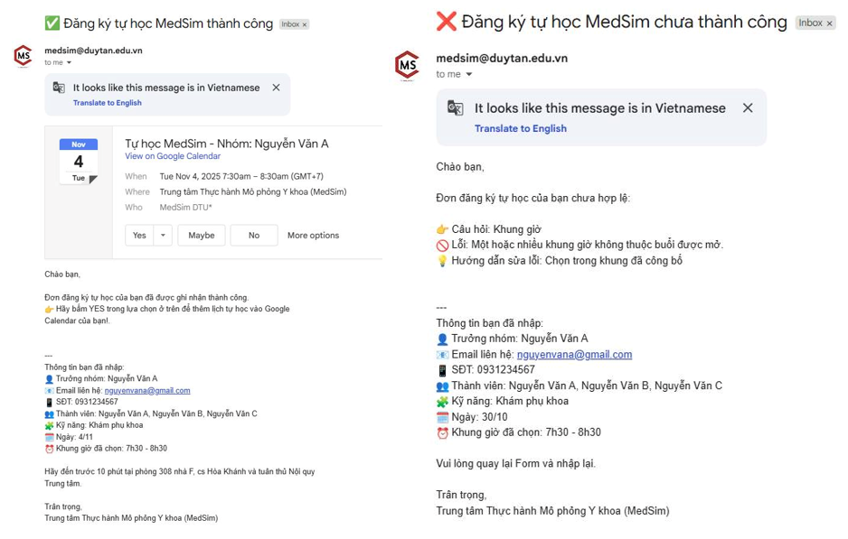 Hình 1. Ví dụ về phản hồi đăng ký tự học từ MedSim