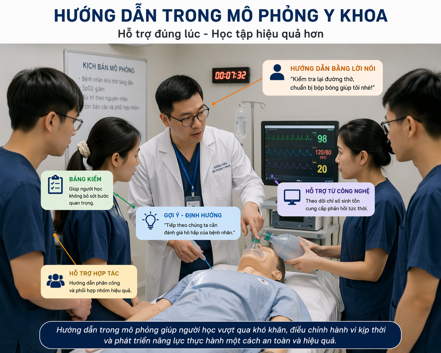 Trong giáo dục y khoa, mô phỏng không chỉ là công cụ để người học thực hành kỹ năng lâm sàng trong môi trường an toàn, mà còn là không gian để hình thành tư duy, phản xạ chuyên môn và năng lực ra quyết định. Bên cạnh giai đoạn chuẩn bị trước mô phỏng và thảo luận sau mô phỏng, ngày càng có nhiều bằng chứng cho thấy hướng dẫn ngay trong lúc mô phỏng đang diễn ra cũng giữ vai trò rất quan trọng. Hình thức hỗ trợ này giúp người học hiểu tình huống tốt hơn, điều chỉnh hành vi kịp thời và phát triển năng lực thực hành một cách hiệu quả hơn.