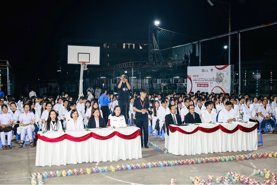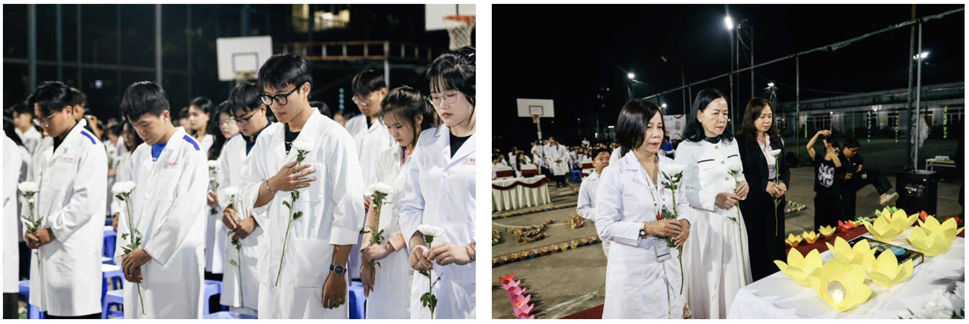 Tại buổi lễ, sắc áo blouse trắng bao phủ khắp không gian buổi lễ, từng ngọn nến được thắp lên như biểu tượng của sự tôn kính và biết ơn. Bên cạnh nghi thức thắp nến, nghi lễ dâng hoa cũng được quý thầy cô và sinh viên trang trọng thực hiện, gửi gắm trong từng đóa hoa là lòng thành kính, sự tri ân sâu sắc và lời hứa tiếp bước trên con đường y học bằng y đức và trách nhiệm.
